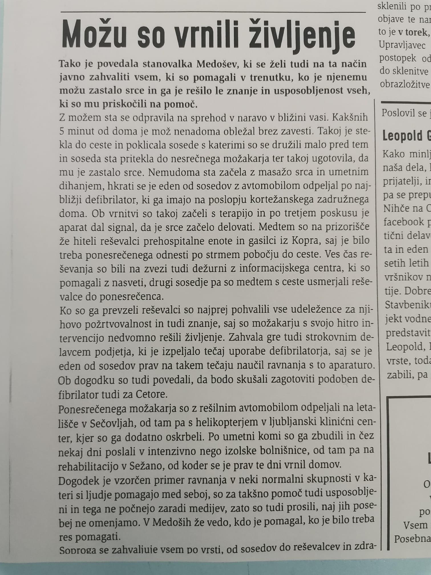 Ena od teh zgodb je bila objavljena v Primorskih novicah julija 2021. Velja poudariti, da so se izkazali prav vsi – ponesrečenčeva žena, sosedje, gasilci, reševalci.