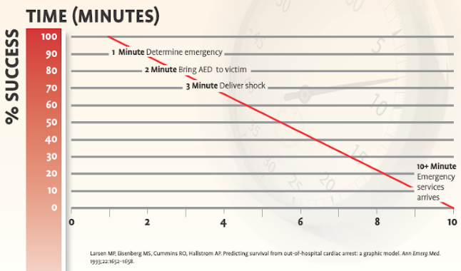 Pri srčnem zastoju je vsaka minuta pomembna. V diagramu je v raziskavi prikazana odvisnost uspešnosti preživetja pri srčnem zastoju od časa nudenja temeljnih postopkov oživljanja in defibrilacije. AED rešuje dragocene minute.